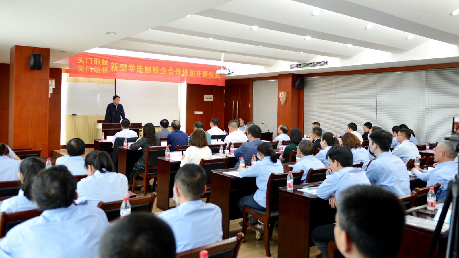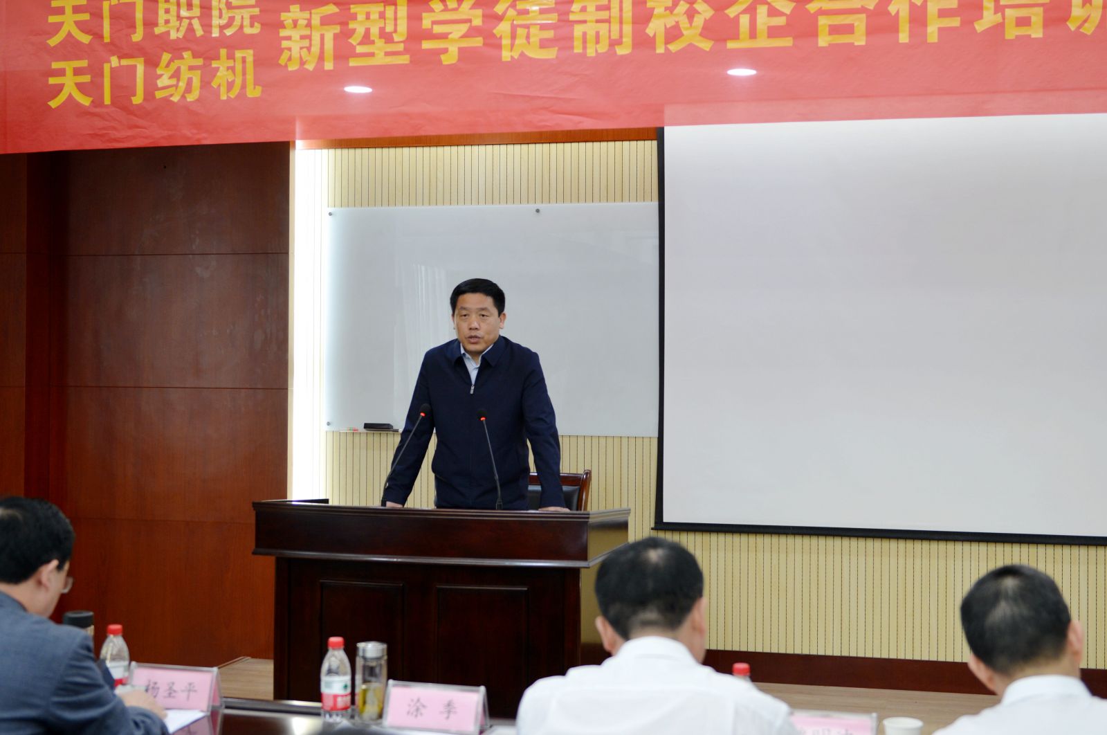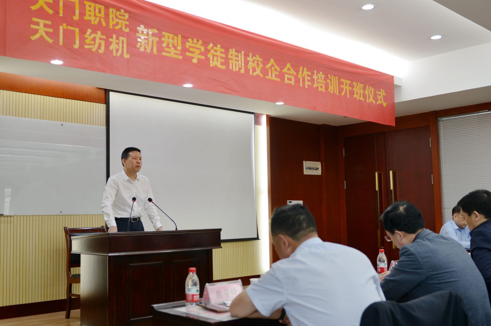 2022年4月9日,春光明媚,弱柳扶風。天門紡機與天門職院新型學徒制技能人才培訓開班儀式在天門紡機科技大樓隆重舉行,市委常委常務(wù)副市長涂季、市人力資源和社會保障局局長楊圣平、市企業(yè)聯(lián)合會執(zhí)行會長魏明波、市經(jīng)濟和信息化局副局長吳郁民、天門職業(yè)學院校長熊安鋒、全國人大代表天門紡機董事長沈方勇出席了開班儀式,天佳日用、徐工環(huán)保、昌達塑業(yè)、武住電裝、今御龍醫(yī)療、安潤紡織等6家企業(yè)代表及市有關(guān)媒體應(yīng)邀參加了會議。天門紡機總經(jīng)理焦倫進主持會議。