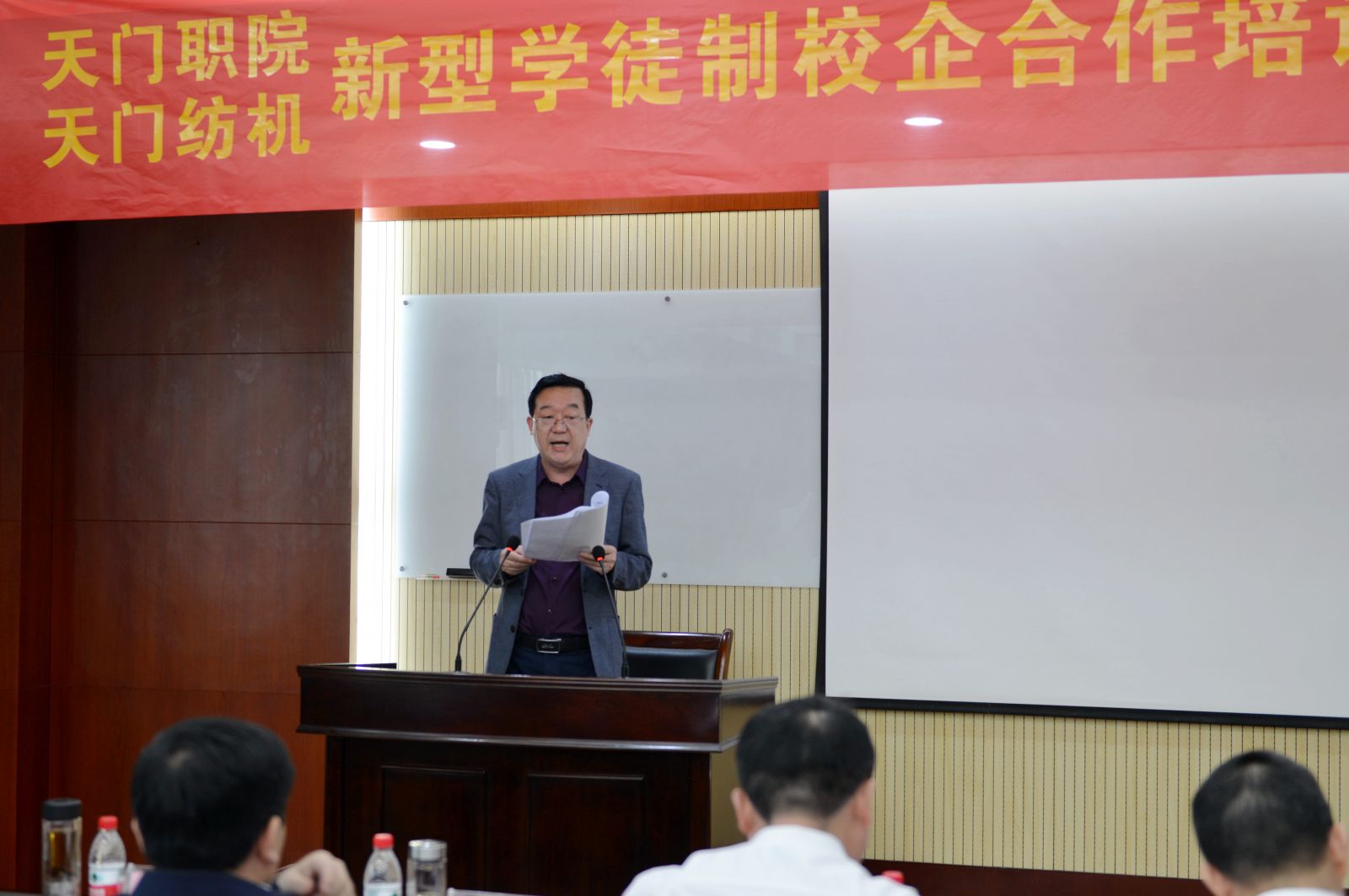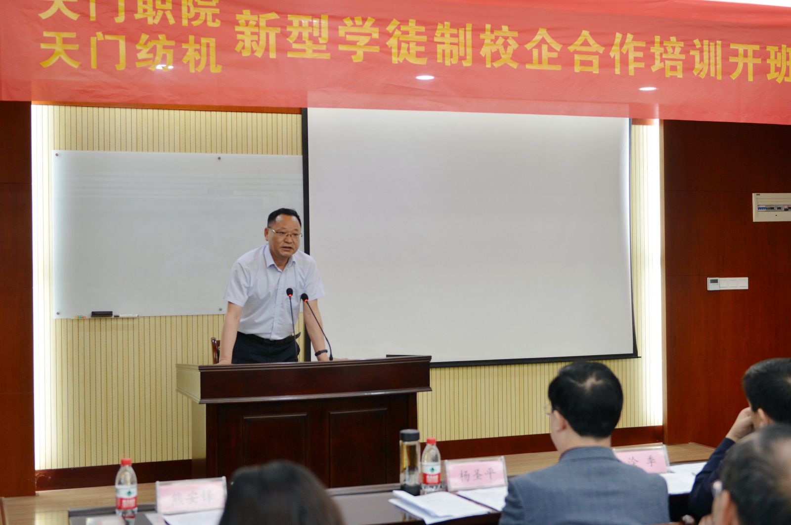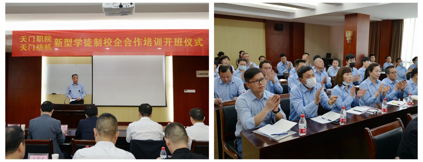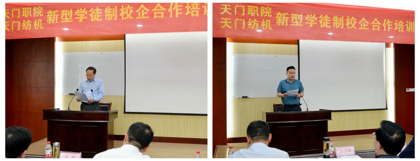 天門紡機黨委書記魯?shù)挛慕榻B了《天門職院與天門紡機新型學徒制培訓方案》,天門職業(yè)學院教師何漢兵作了發(fā)言,他代表全體培訓教師表態(tài),一定不負期望,精心備課,靈活施教,圓滿完成教學任務(wù)。