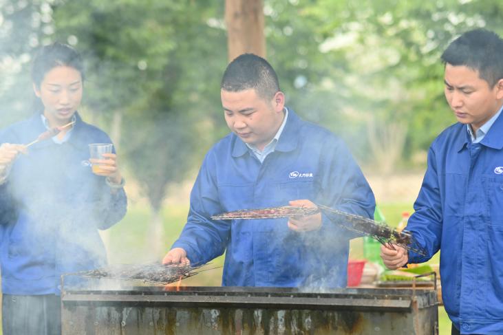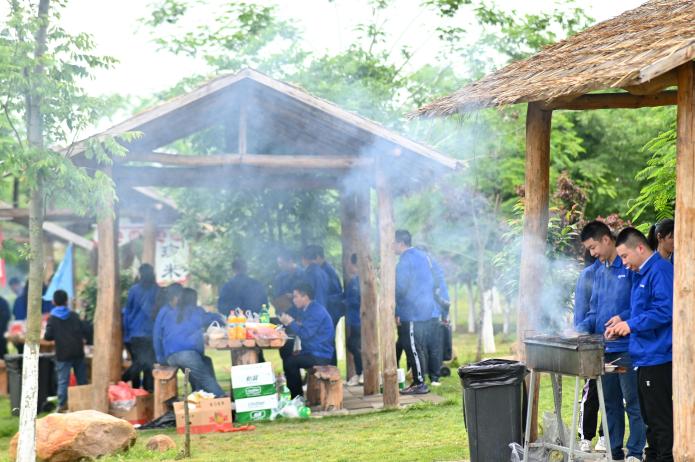 帶著依依不舍的心情,青年員工們告別張家湖國家濕地公園,來到皂市長壽村原村。這是一座位于皂市鎮(zhèn)境內(nèi)的農(nóng)家樂,田園氣息濃烈,采摘和燒烤樂趣無窮,大家直奔燒烤專區(qū)。幾名青年員工已提前將炊具、餐具和食材運(yùn)送到目的地,大家不顧疲憊,開始分配工作,我是“支賓先生”,你是“炊事員”,她是“勤雜員”。一會兒后,炊煙升起,香氣四溢,有燒烤和火鍋的香辣味,有菠蘿的香甜味,有主食的香糯味,更有青年朋友們團(tuán)結(jié)協(xié)作的歡聲笑語。