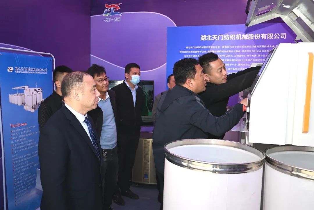 天門紡機(jī)總經(jīng)理焦倫進(jìn)向蒞臨公司展位的晉州市長王林(右2)、中國服裝協(xié)會常務(wù)副會長楊金純(右1)、晉州市紡織服裝行業(yè)協(xié)會會長李永強(qiáng)(左1)介紹公司與晉州紡織企業(yè)合作情況