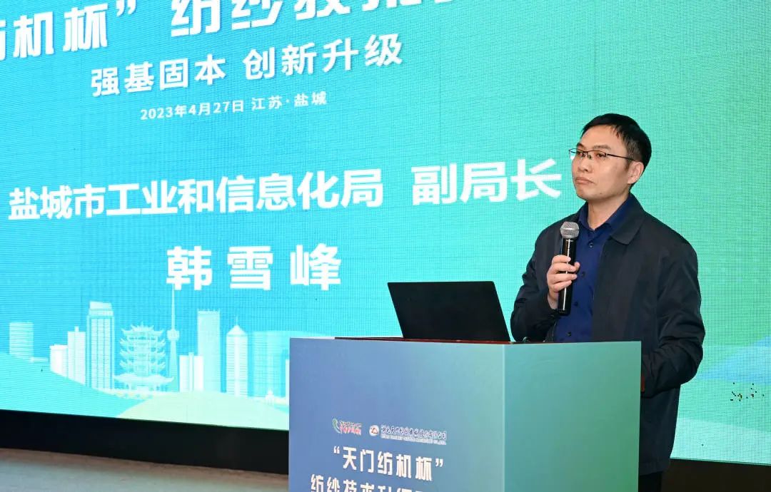 當(dāng)天下午,舉行了開幕式及主題報告演講,鹽城市工業(yè)和信息化局副局長韓雪峰、鹽城市紡織工業(yè)協(xié)會會長戴俊等領(lǐng)導(dǎo)出席會議并分別致辭,他們對“天門紡機杯”的舉辦表示歡迎,希望通過本次活動,加強多地紡織企業(yè)的交流與探討,使鹽城更好地了解市場需求和技術(shù)趨勢,探索鹽城紡織技術(shù)的創(chuàng)新與升級之路。