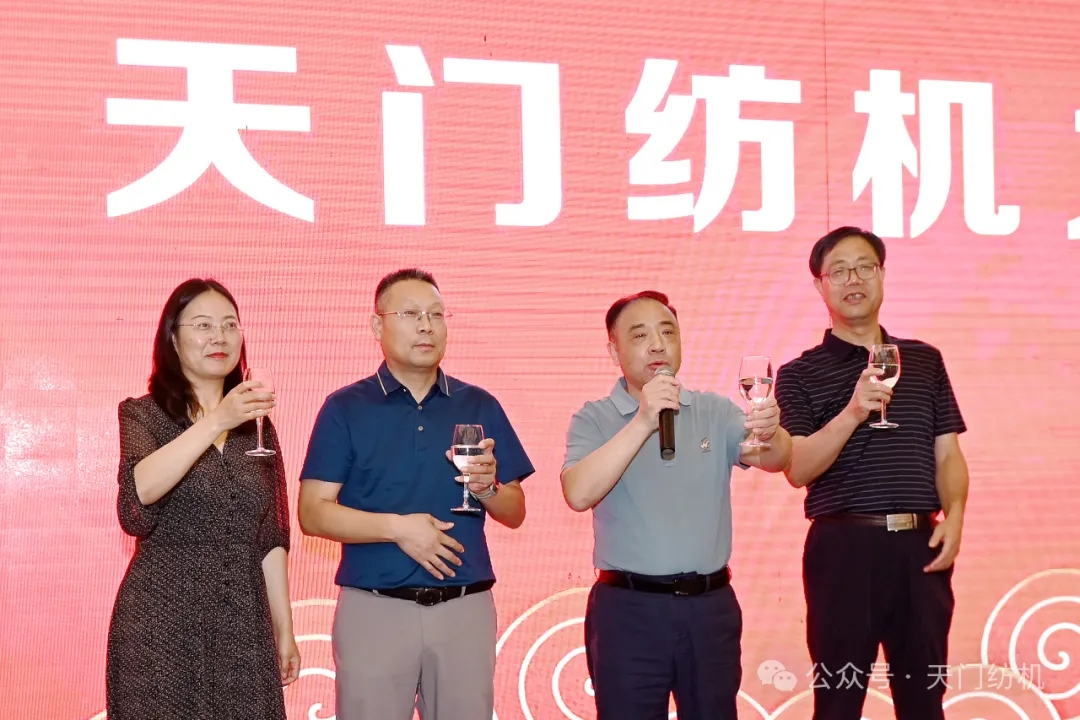 陜西省紡織科學(xué)研究院有限公司黨委書記、總經(jīng)理徐遠(yuǎn)志,天門紡機(jī)總經(jīng)理焦倫進(jìn),天門紡機(jī)副總經(jīng)理肖少華,《棉紡織技術(shù)》期刊社副總經(jīng)理冉軍麗答謝晚宴共同祝酒