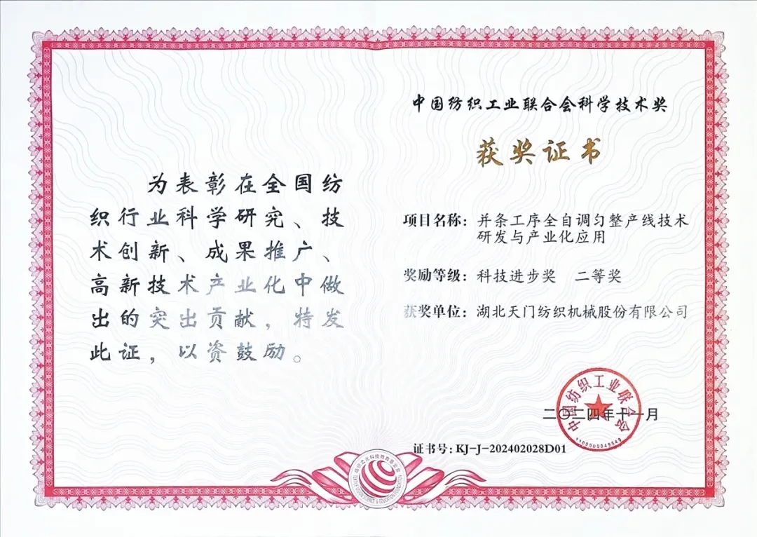 2024年11月12日,在北京人民大會(huì)堂召開的2024年度中國紡織工業(yè)聯(lián)合會(huì)科學(xué)技術(shù)獎(jiǎng)勵(lì)大會(huì)傳來喜訊,由天門紡機(jī)主導(dǎo),武漢紡織大學(xué)、安徽華茂紡織股份有限公司、武漢銀橋南海光電有限公司等單位合作開發(fā)的“并條工序全自調(diào)勻整產(chǎn)線技術(shù)研發(fā)與產(chǎn)業(yè)化應(yīng)用項(xiàng)目”獲得2024年“中國紡織工業(yè)聯(lián)合會(huì)科學(xué)技術(shù)獎(jiǎng)”科技進(jìn)步二等獎(jiǎng)。
