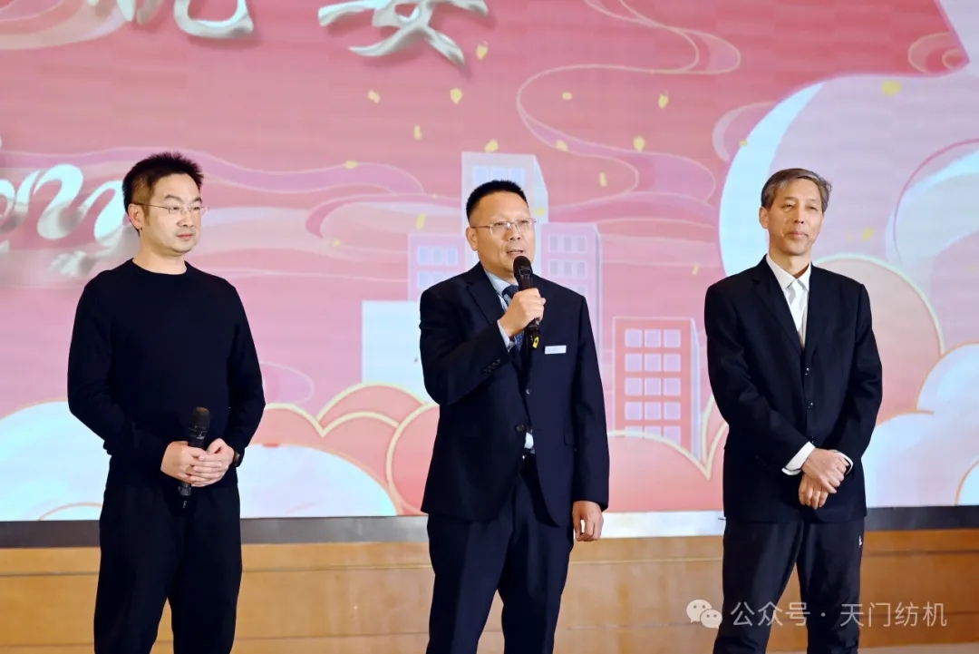 雙清智能總經(jīng)理蔡文超(左)、天門紡機副總經(jīng)理肖少華(中)、紗線網(wǎng)常務副總裁孫其海(右)為晚宴致辭